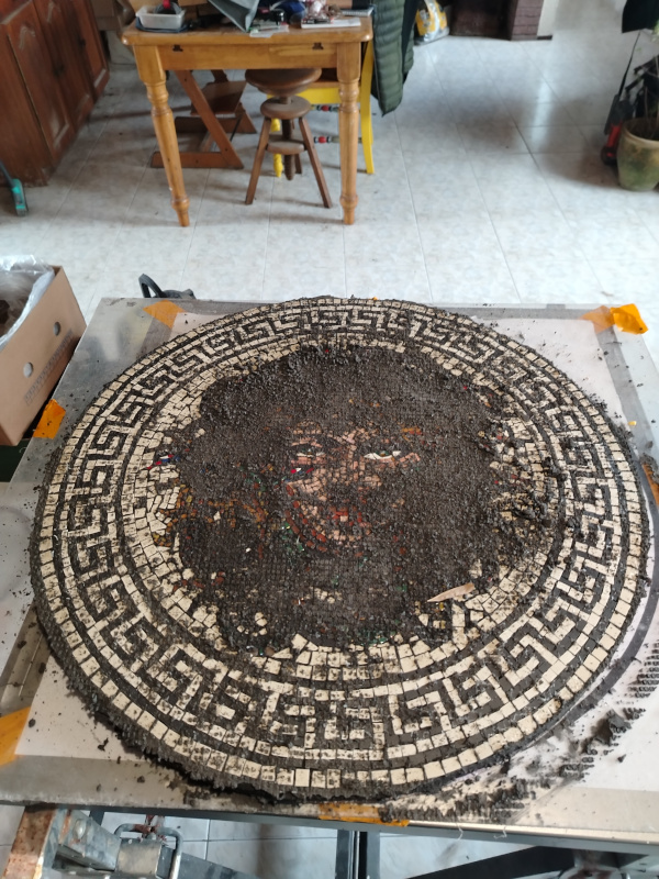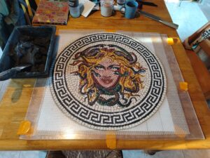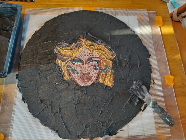 On January 4, 2026, all tesserae had been laid. I still had to mount Medusa on her support, and get her finished for my client. I splattered Medusa’s face with thinset cement.