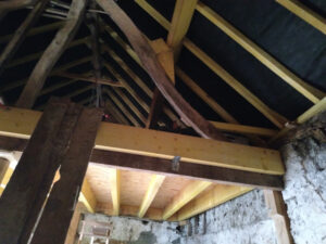 Une fois vides paille, foin et diverses grosse branches sur lesquelles tout cela reposait, Pascal et moi avons renforce la charpente.