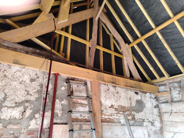 Une fois vides paille, foin et diverses grosse branches sur lesquelles tout cela reposait, Pascal et moi avons renforce la charpente.